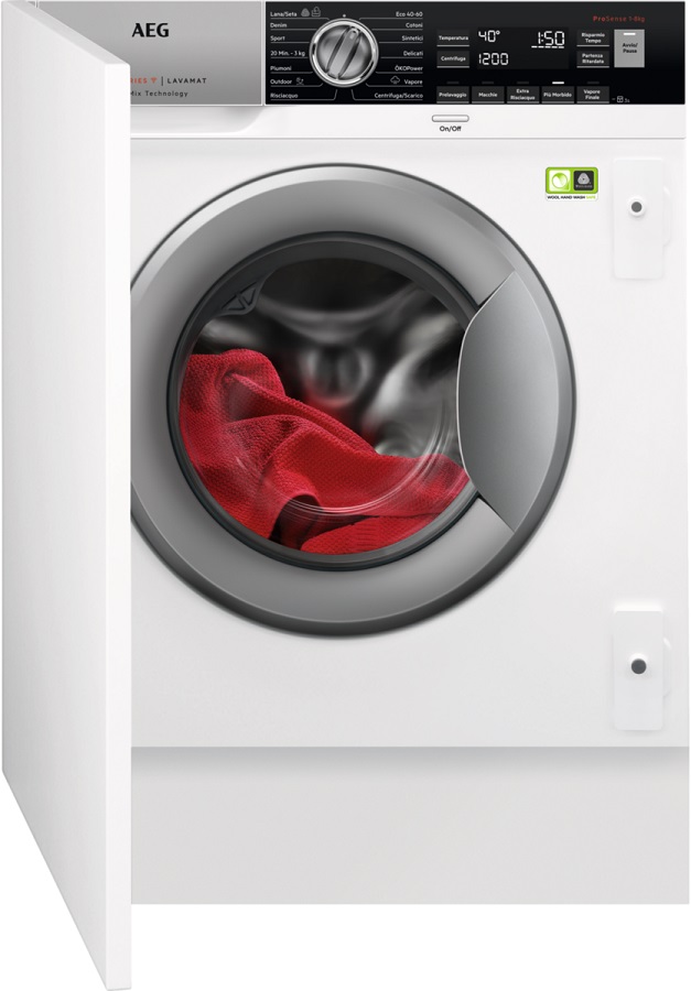 Aeg L8FEE84BI Lavatrice integrata totale Serie 8000 con WiFi Benefit - Lavatrice frontale Serie 8000 - Classe di efficienza energetica A - Tecnologia OKOMix, premiscela detersivo e ammorbidente - Tecnologia ProSteam® , fino al 30% in meno di pieghe sui capi - Tecnologia ProSense® , consumi ottimizzati in base al carico automaticamente Programmi e opzioni - Programmi: Eco 40-60, Cotone, Sintetici, Delicati, OKOPower, Vapore Refresh, Centrifuga/Scarico, Risciacquo, Outdoor, Hygiene, 3 Kg 20 minuti, Sport, Denim, Lana/Seta - Programma Vapore specifico per capi ultra delicati - Opzioni: Prelavaggio, Macchie, Extra Risciacquo, SoftPlus, Vapore Finale, Start/Pausa - Programma Lana con certificazione Woolmark Green Specifiche tecniche - Aqua control sensor - Flussimetro - Pressostato Estetica - Grande Display LCD con Touch Control - Oblò dark silver - Cesto con microfori in acciaio inox da 52 litri - Filtro ispezionabile - 4 piedini regolabili - Dimensioni mobile/totale (AxLxP): 81,9x59,6x54 cm