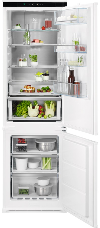 Frigocongelatore combinato Serie 8000 Cooling 360° Benefit - Cooling 360: raffreddamento in ogni angolo grazie al sistema di ventilazione multiflow con pannello in acciaio inox - Cassetto sigillato GreenZone Plus con controllo umidità automatico per preservare al meglio le vitamine, il sapore e la consistenza della frutta e verdura fresca - Tecnologia TwinTech® Total No Frost Plus: due sistemi di raffreddamento indipendenti con temperature sempre stabili - Vani interni realizzati in plastica riciclata rendendo il prodotto costruito con il 70% di plastica riciclata - Scongelamento e sbrinamento automatici - Compressore inverter con garanzia 10 anni Specifiche tecniche - Classe di efficienza energetica D - Capacità totale vano frigorifero 186 lt - Capacità totale vano congelatore 62 lt - Capacità di congelamento 8 kg/24 h - Silenziosità 36 dB(A) - Pannello digitale con dual control: regolazione separata della temperatura del frigorifero e del congelatore - Illuminazione a LED 1 superiore e 2 laterali - Filtro Clean Air+ Funzioni/Programmi - Pannello di controllo con ECOMETER - ECO Mode: limpostazione più efficiente dal punto di vista energetico - Funzione COOLMATIC®: raffreddamento rapido - Funzione FROSTMATIC®: congelamento rapido - Allarme luminoso e acustico alta temperatura - Allarme luminoso e acustico porta aperta: frigo e congelatore Installazione - Installazione a traino - 2 porte reversibili con incernieramento a destra Dotazione interna - Frigorifero - 4 ripiani in vetro di cui 1 sdoppiabile FlexiShelf, cassetto GreenZone Plus con controllo umidità automatico, cassetto ExtraChill, 1 contenitore burro, 1 mensola per bottiglie, 1 mezzo ripiano amovibile, 1 mensola trasparente, 2 portauova Congelatore - 3 cassetti, 1 vaschetta del ghiaccio
