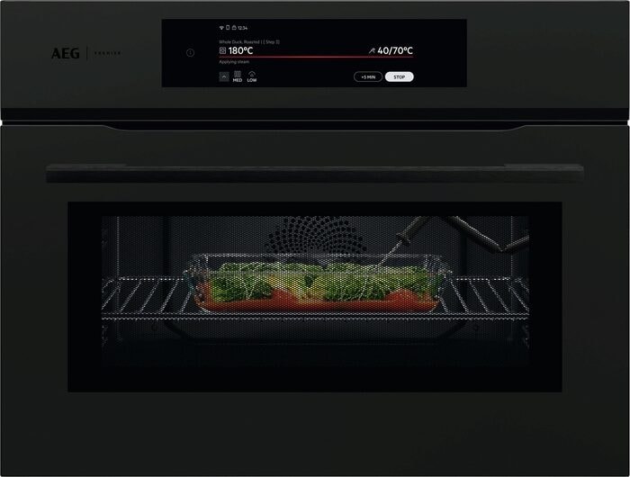 Aeg PK9000WT Forno Serie 9000 ProAssist CombiQuick Benefit - Forno combinato microonde+grill - Cavità smaltata - Connettività integrata (Wi-Fi) - Termosonda per la misurazione della temperatura al cuore degli alimenti - Pulizia AquaCleaning - Grafica Logo Premier Line Programmi & funzioni - 24 funzioni di cottura: 2 modalità di cottura finale, cottura tradizionale, 4 modalità di cottura termoventilata, funzione microonde, funzione grill+ microonde, doppio grill+microonde, cottura ventilata con microonde, cottura convezione+microonde, riscaldamento, grill, lievitazione impasto, scongelamento, modalità stufato, modalità arrosto, slow cooking, marmellate e conserve, riscaldamento piatti, scaldavivande, disidratazione, fusione - Potenza grill 1900 W - Potenza convezione 1650 W - Potenza microonde 1000 W - Cottura guidata di 111 ricette preimpostate - Riscaldamento rapido automatico - Display CookSmart Touch+ 8" - Contaminuti - Segnale acustico di fine cottura - Potenza massima assorbita 3,0 kW - Sicurezza bambini (blocco accensione) - Spegnimento automatico di sicurezza Caratteristiche tecniche & dotazione interna - Volume 44 litri - Controllo elettronico della temperatura - IsoFront® Top - sicurezza porta fredda con 4 vetri - Luce alogena - Vetri interni estraibili - Guide laterali EasyEntry - 1 Lamiera dolci, 1 Leccarda, 1 griglia - Sistema OptiFlex (4 livelli di posizionamento teglie) - Accessorio Snapper Kit: ganci per l'installazione Installazione - 45 cm di altezza Design - Estetica Premier Line Matt Black