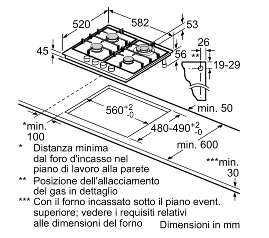 1 x 582 x 520 - Dimensioni di installazione (AxLxP mm) : 45 x 560 x (480 - 490)