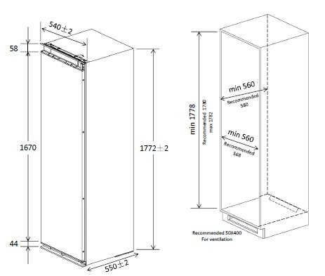 T Motore Standard Display LED Vano frigorifero Capacità netta 255 l Numero ripiani 4 Numero balconcini 5 Fresh Area Cassetto Crisper Porta uova Vano congelatore Capacità netta 30 l Numero ripiani 2 Vaschetta ghiaccio Dimensionamento AxLxP (mm) Prodotto: 1772 x 540 x 550 Nicchia: 1778 x 560 x 560 (raccomandato 580)