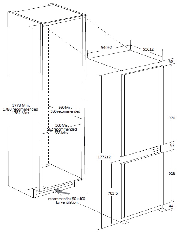 T Motore Inverter Display LED Vano frigorifero Capacità netta178 l Numero ripiani 3Numero balconcini 5 AdaptiveHumidityArea CassettoCrisper Porta uova Vano congelatore Capacità netta 73 l Numerocassetti3 Vaschettaghiaccio Dimensionamento AxLxP(mm) Prodotto: 1772 x 540 x 550 Nicchia: 1778 x 560 x 560 (raccomandato580)