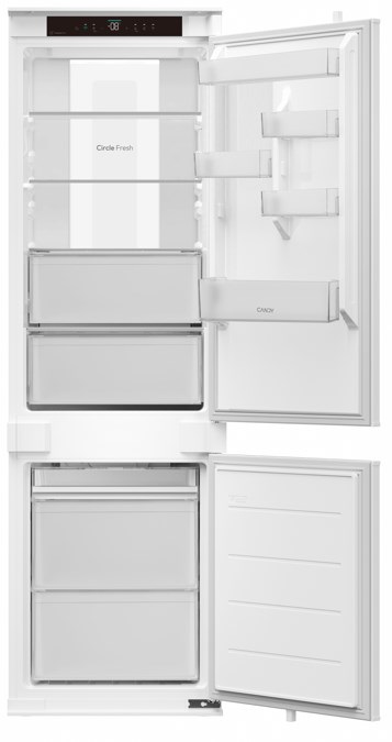Classe energetica E Tecnologia Total No Frost Sistema Aerazione Candy CircleFresh Capacità netta totale 251 l Illuminazione Panorama Light Super raffreddamento/Super Congelamento Funzione ECO Funzione Vacanza Allarme porta (Acustico) Livello sonoro 35 dB Cerniere scorrevoli Classe climatica SN.
