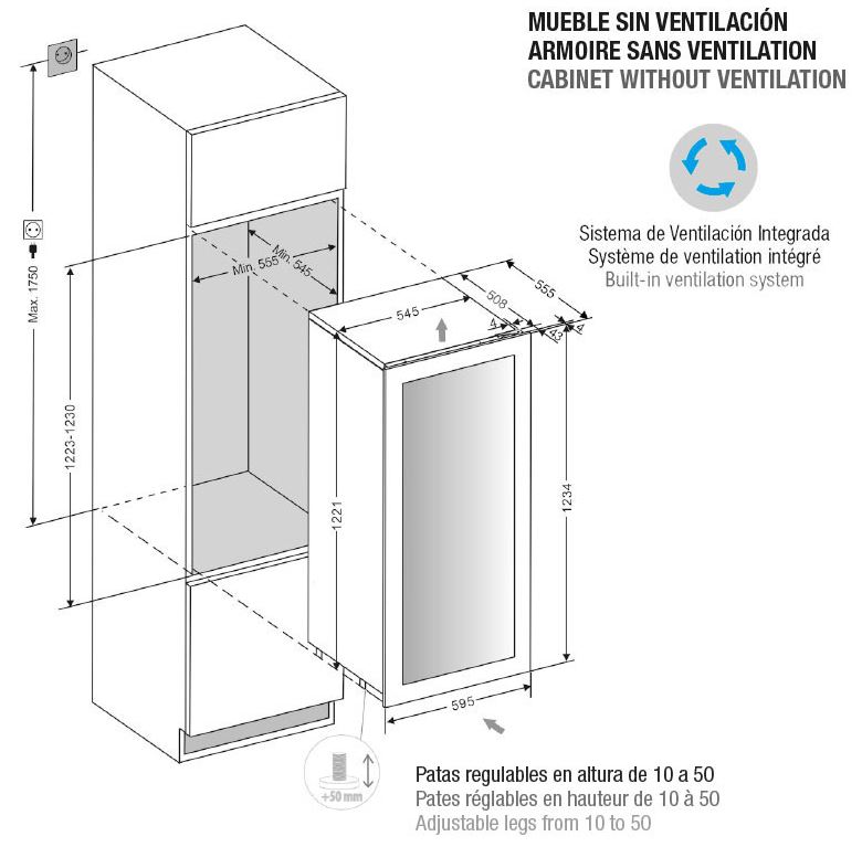 N° di bottiglie (tipo bordolese da 0,75 litri): 65 Dimensioni: 595x1234x559 mm Temperatura: 2 Temperatura operativa: +5ºC a +20ºC Capacità (litri): 182 Consumo energetico: 151 KwH/ano Livello acustico: 36 db N° di vetri sulla porta: 3 Guide telescopiche Filtro a carbone attivo