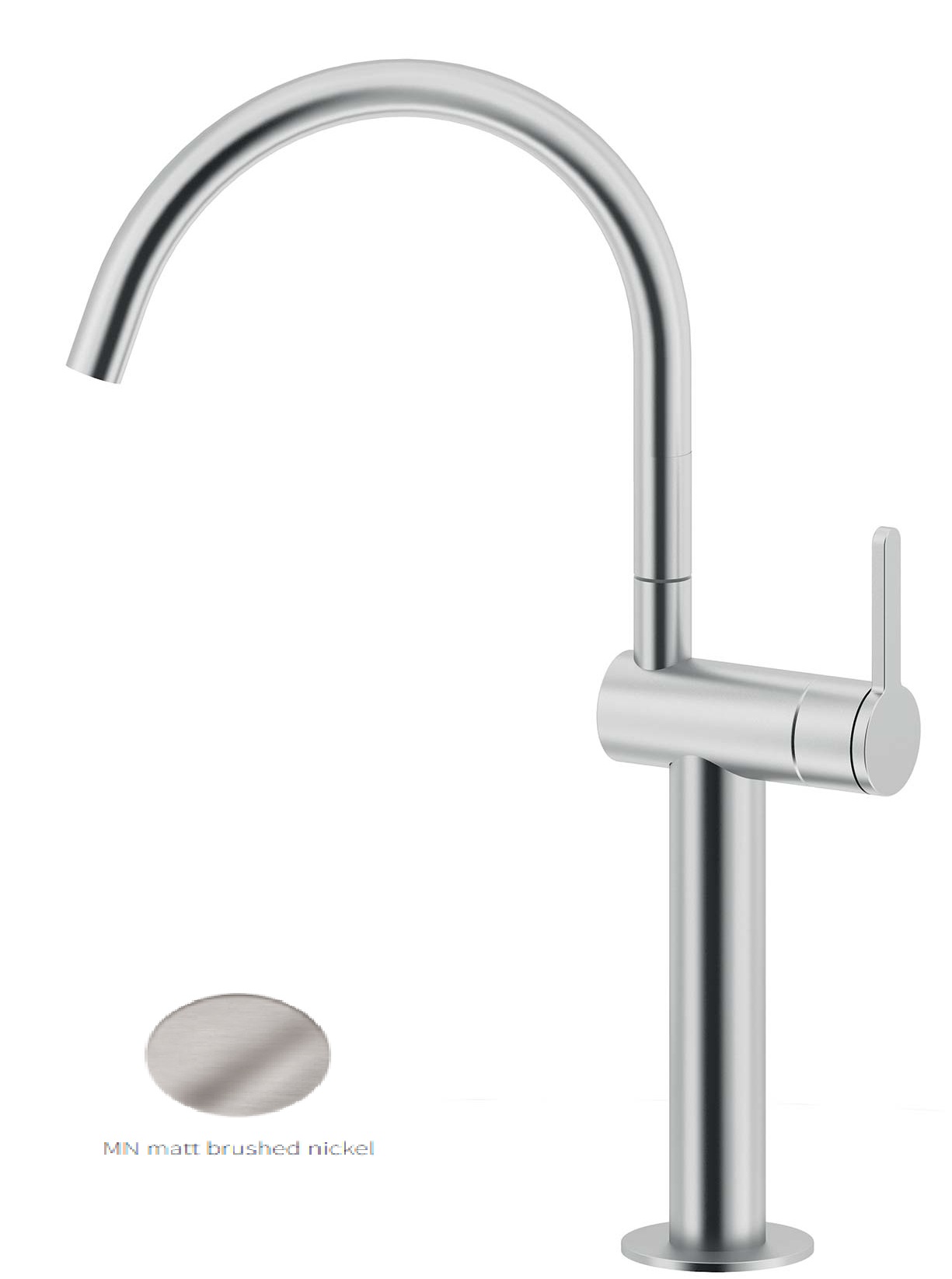 FINITURA NICKEL SPAZZOLATO · Miscelatore monocomando con bocca girevole 360° · H.