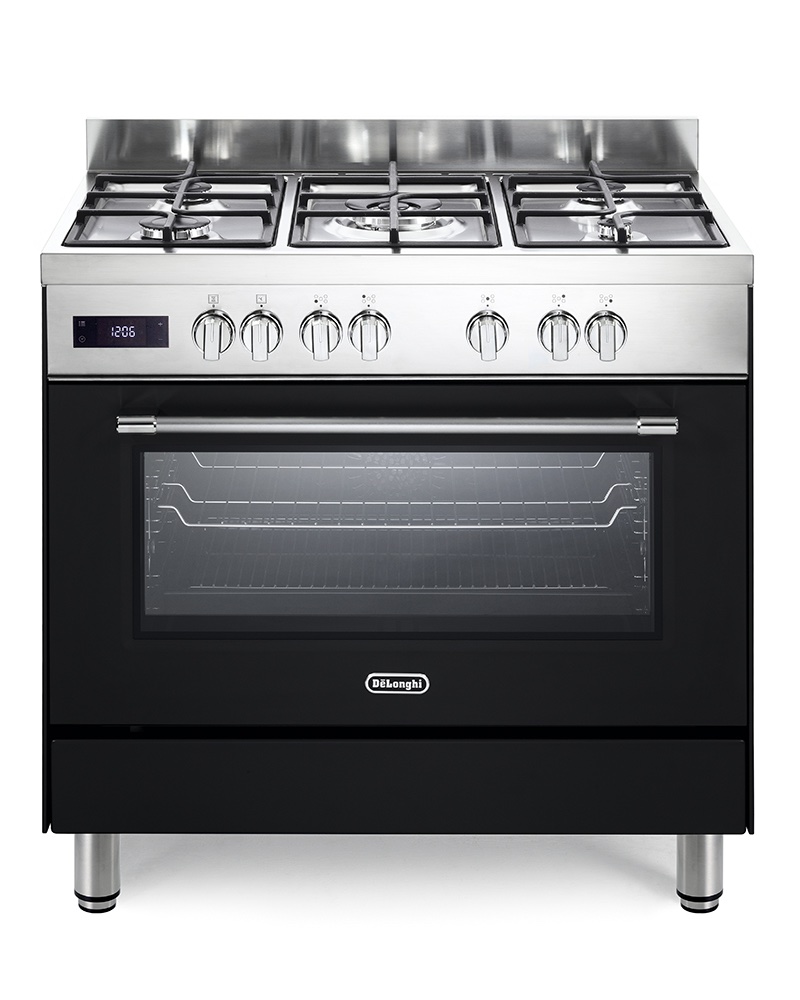 Cucina a libera installazione 90×60 dal design professionale, 5 bruciatori gas di cui un doppia corona, robuste griglie in ghisa, forno elettrico con 9 funzioni.