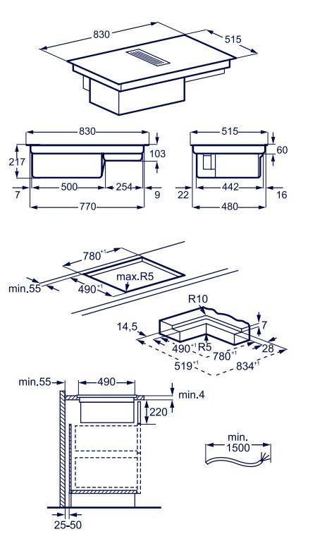 Dimensioni (mm, Larghezza x Profondità): 830x515.