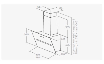 DAL PIANO COTTURA · Gas 65 cm · Induzione/Radiante 45 cm MATERIALI & DIMENSIONI · 60 - 90 cm · Aspirante: Vetro bianco, vetro nero ILLUMINAZIONE · Tipo LED 2x1,5 W · Intensità 180 LUX · Temperatura 3500 K · Filtro grassi alluminio incluso · Camino incluso PERFORMANCE · Comandi Touch control capacitivo 3V+I · Portata intensiva 650 m3/h · Livello sonoro min-max 5265 dB(A) · Assorbimento totale 233 W
