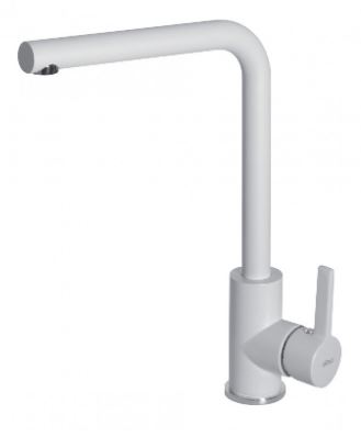 Miscelatore monocomando in colore bianco e finitura Granitek, con canna girevole e leva sanitaria per un facile controllo del flusso d'acqua.