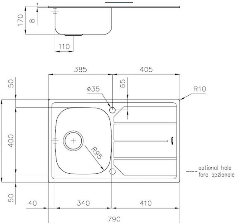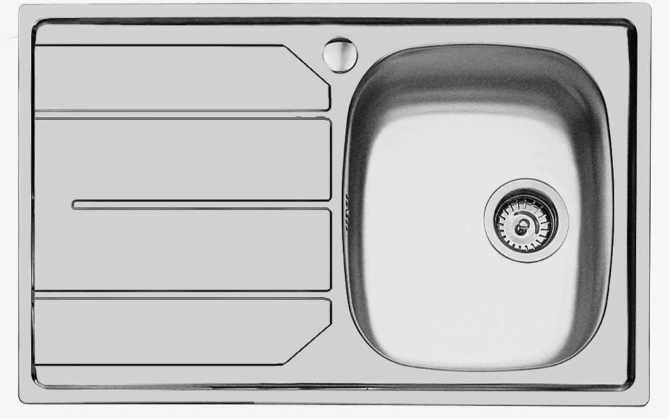 LAVELLO SOPRATOP VASCA DX 79CM X 50 CM BASE 45CM FORO INCASSO (LxP) 77x48 · Piletta: 3½ · Vasca cm 34x40 · Profondità cm 17 · Spessore acciaio 0,6 mm