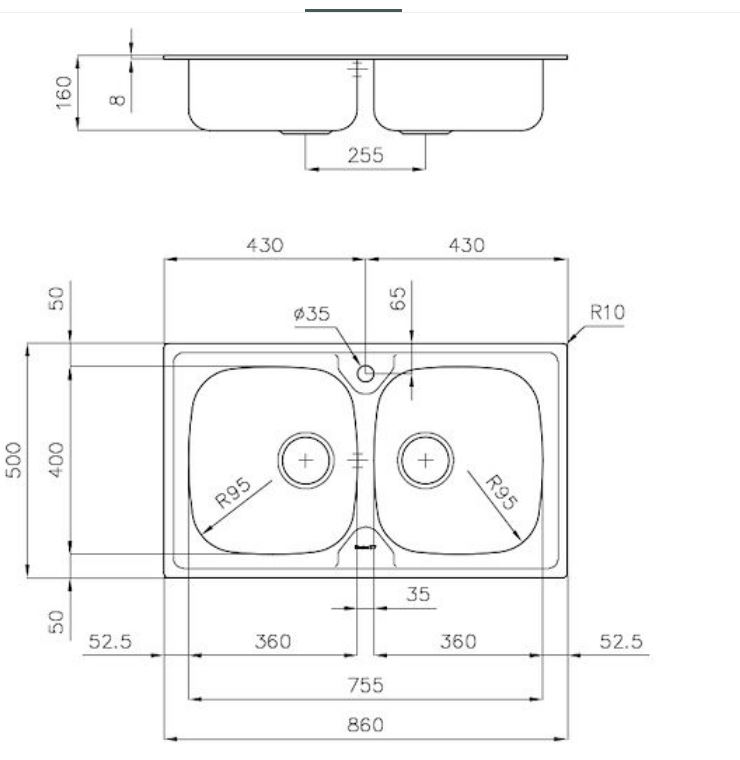 LAVELLO 2 VASCHE 86CM X 50 CM BASE 80-90 FORO INCASSO 840 x 480 mm MISURE VASCHE 360x400mm Piletta 3,5"