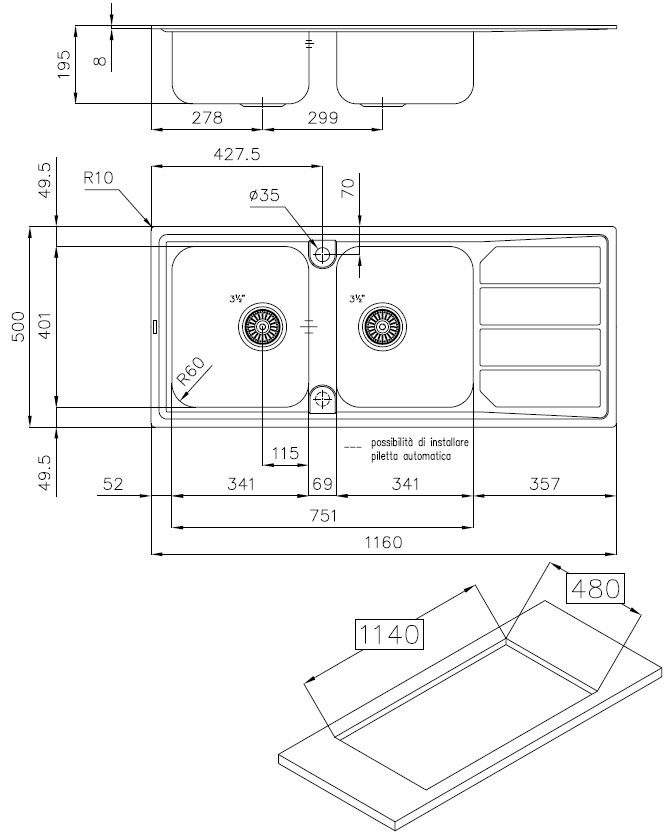 Foster lavello Elettra 116 2V STD - 5812 062 con vasche a sx.