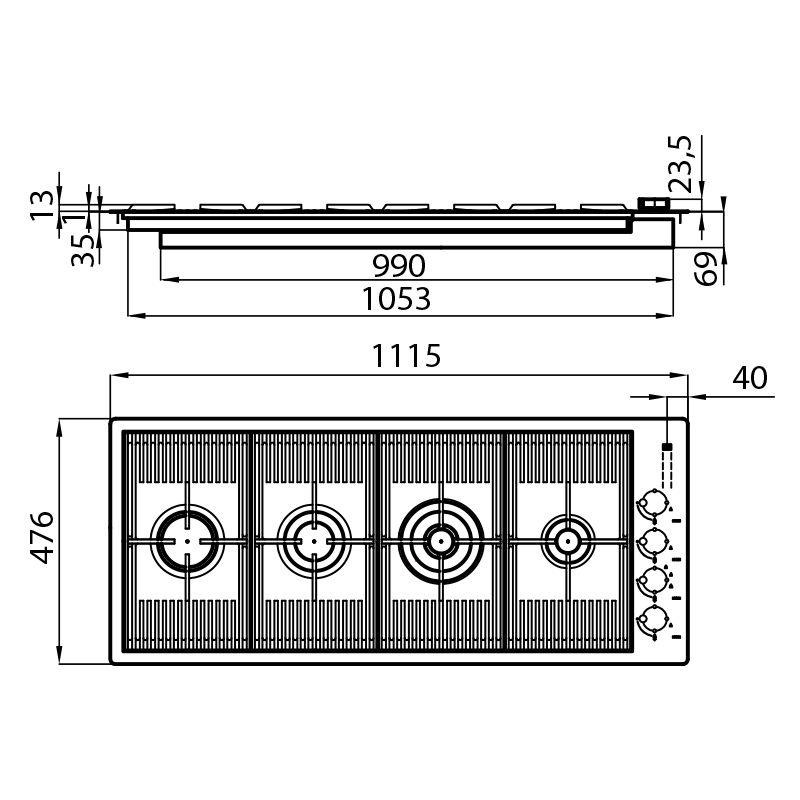 Materiali e finitura Acciaio inox AISI 304 - finitura spazzolato Bordo Installazione Bordo filotop - per installazione a filo piano (FT) o per incasso sopratop (FTS) Elementi riscaldanti 4 Fuochi Griglie Griglie in ghisa e coprispartifiamma smaltati Tipo di Accensione Accensione elettrica sottomanopola Foster 7681 000 piano cottura.