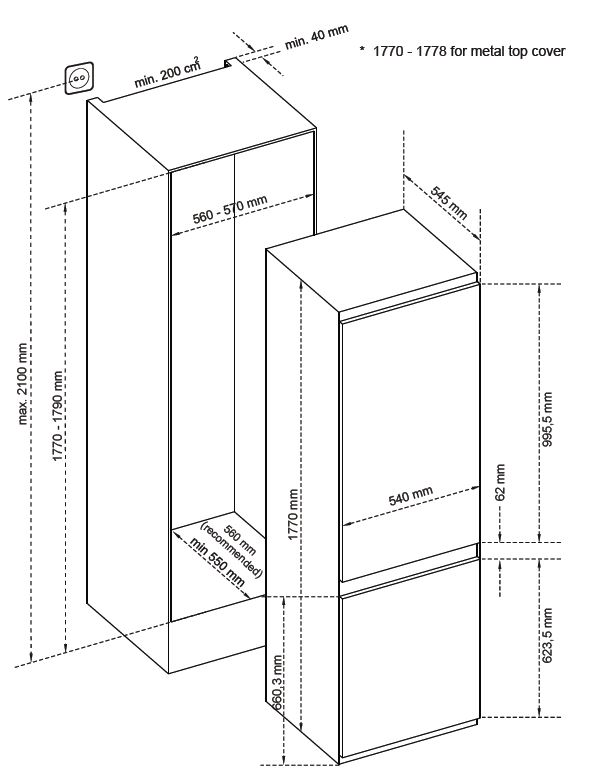 Tecnologia di Raffreddamento Frost Free Sbrinamento Automatico per Frigorifero e Congelatore Nessun Miscuglio di odori tra Frigorifero e Congelatore Termostato Meccanico e Controllo della Temperatura Opti-CrispZone con Controllo dell'Umidità per Condizioni di Conservazione Ottimali per Frutta e Verdura 4 Ripiani nella porta con utilizzo flessibile per bottiglie e alimenti Vassoio Scorrevole nel congelatore per un utilizzo e conservazione flessibili Porta Reversibile con cerniera scorrevole Facile da Installare Opti-CrispZone/No mix odori/Porta Reversibile Controllo Umidità/Senza ghiaccio Protezione congelatore Volume Netto - Totale (L) Volume Netto - Frigorifero (L) Volume Netto - Congelatore (L) Classe Energetica Classe Climatica Silenziosità Dimensioni - LxPxA (mm) 243 180 63 E T/N 41 dB 540 x 545 x 1770