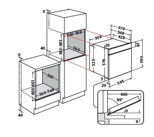 81 kWh  Superficie di cottura: 1020 cm2  Temperatura massima di cottura: 250°  Contaminuti programmabile  Potenza massima nominale regolabile: 2900 W  Potenza grill 1800 W  Ventilazione di sicurezza radiale  Numero vetri: 2  Tensione: 220-240 V  Corrente: 13 A  Frequenza: 50/60 Hz DIMENSIONI  Dimensioni del prodotto (AxLxP): 595x595x551 mm  Dimensioni del vano per l'incasso (AxLxP): 600x560x555 mm