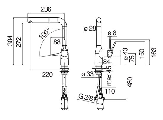 Limitatore di portata con freno al 50% Bocca girevole 180° (adattabile 120° o 360°) Doccetta monogetto estraibile Flessibili inox ø 3/8