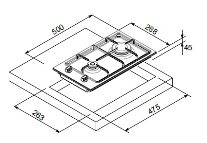 Piano LINEA MILANO 29 x 51 2 fuochi: 1 ausiliario 1,00 kW 1 rapido 3,00 kW Griglie in ghisa Comandi a manopole con accensione automatica