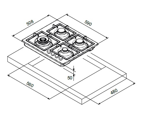 Piano LINEA TORINO 60 x 51 4 fuochi: 1 ausiliario 1,00 kW, 2 semirapidi 1,75 kW 1 rapido 3,00 kW Griglie in ghisa Comandi a manopole con accensione automatica