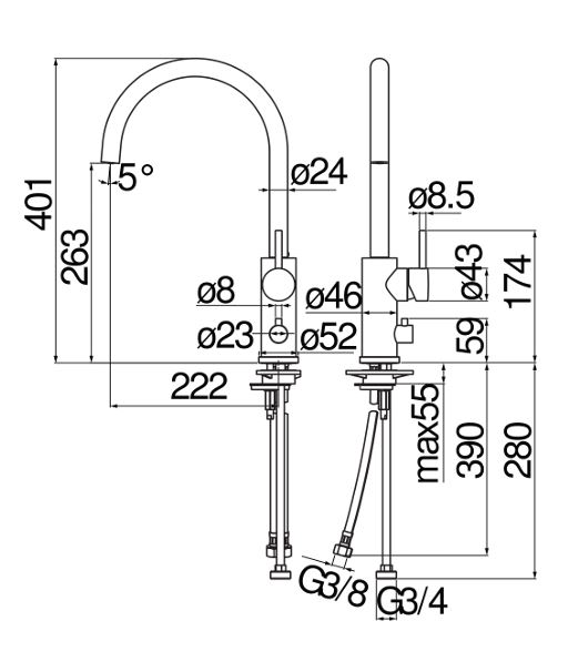 Miscelatore Cromato monocomando con attacco lavastoviglie Limitatore di portata con freno al 50% Bocca girevole 360° Aeratore anticalcare M 21,5 x 1 Flessibili inox ø 3/8