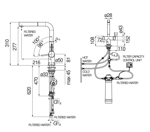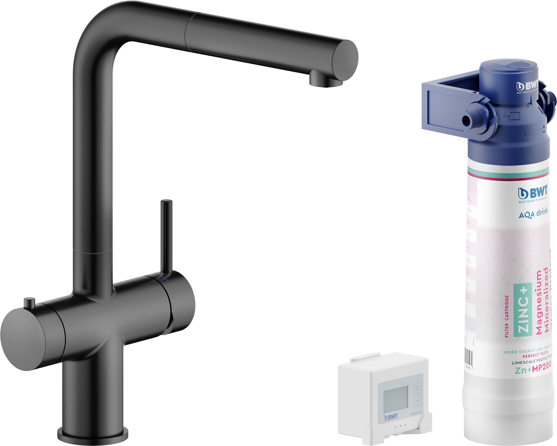 · Limitatore di portata con freno al 50% · Bocca girevole 180° (adattabile 120° o 360°) · Doccetta Dual Flow estraibile · Filtro AQA drink Zinc + Magnesium BWT 650 lt (22°F) · Monitor controllo capacità filtro (batterie non incluse) · Cartuccia garantita 20 anni · H bocca 27,7 (h totale 31 cm)
