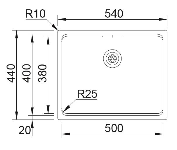 MISURE ESTERNE 540x440mm MISURE VASCA 500x400mm PROFONDITÀ VASCA 200mm BASE 600mm