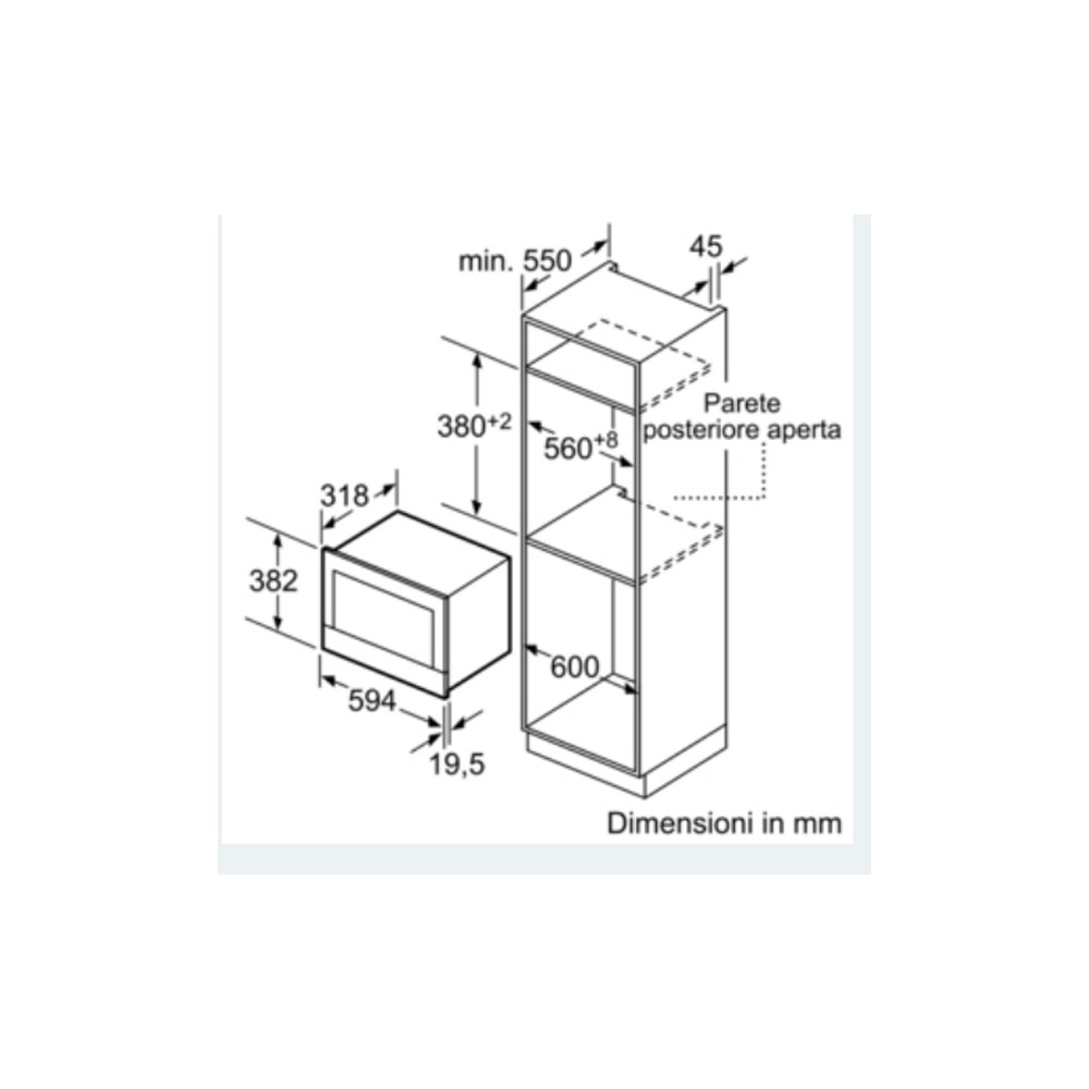 Dimensioni nicchia (AxLxP)mm: 560-568 x 362-382 x 300.