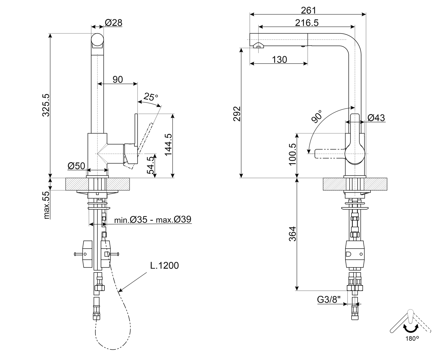 Rotazione canna girevole: 180 °.