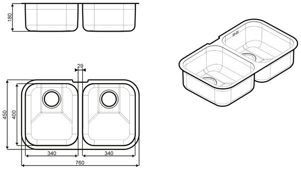 Dimensioni vasca sinistra: 340 x 400 x 180 mm.